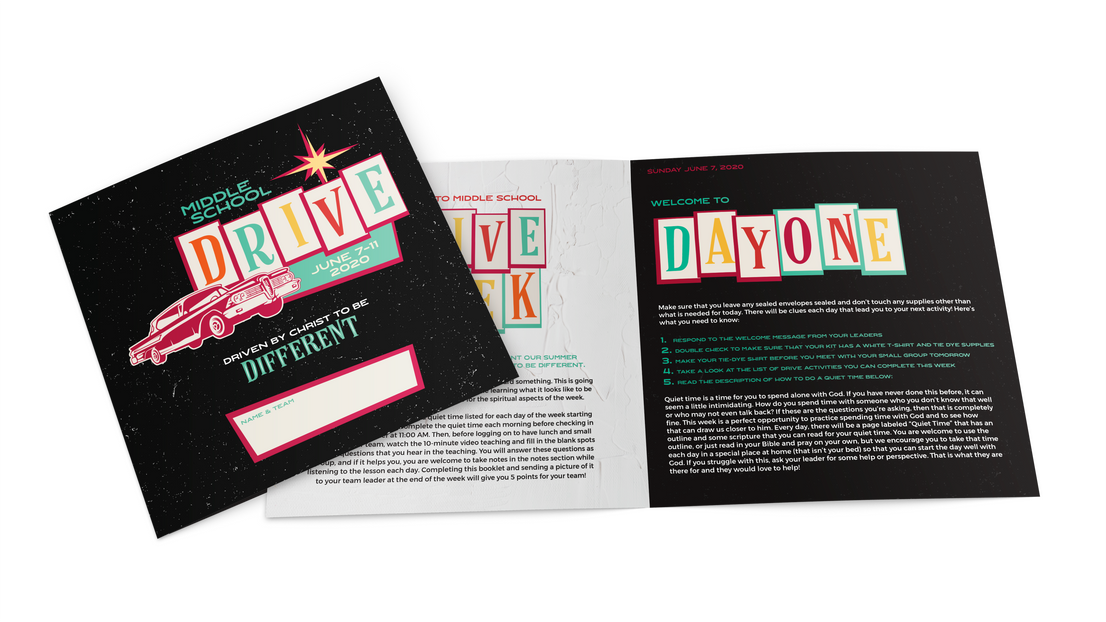 Because of COVID-19, Peachtree Church created a virtual camp experience for their Middle School aged students. The first week, Drive, is a traditional camp experience with small groups, lessons, and devotionals, and the second week, Serve, that follows is a week of missions where the students participate in a week long volunteer project. The booklets for both weeks were to accompany a virtual platform that the camp was held on and therefore needed to be very engaging and consistent with the "drive in movie" theme that was established by the camp directors. The booklets took a fifties drive in feel and played on pops of color to create an edge and trendy touch for today's youth.